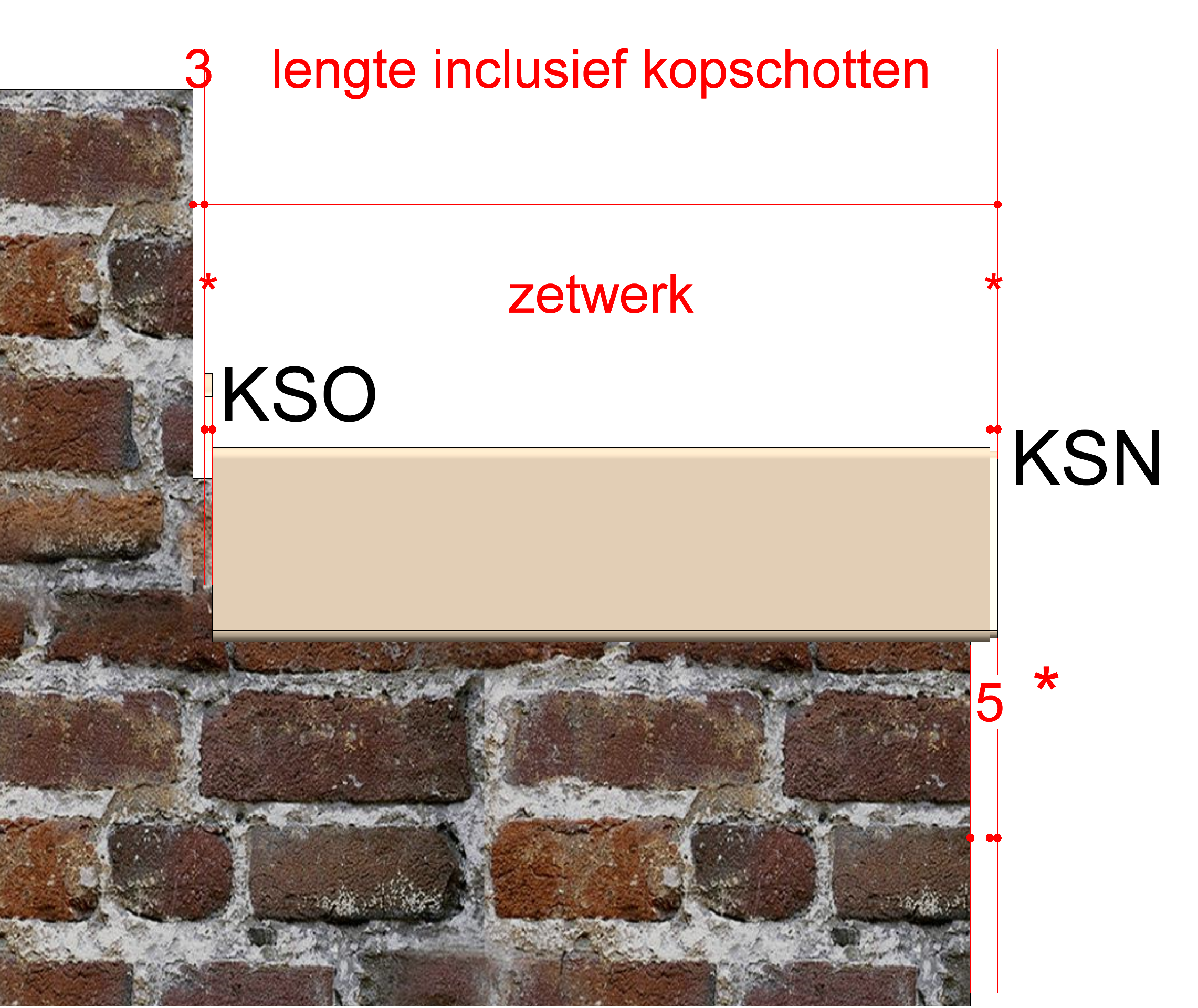 *)= dikte van het kopschot is gelijk aan de dikte van het materiaal waar het zetwerk van wordt gemaakt.