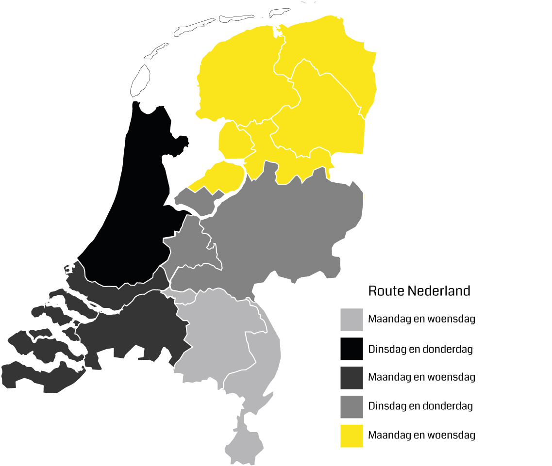 Bij Compri Aluminium hebben we het transport strak geregeld via vaste routedagen in Nederland en België. Zo houden we overzicht, blijven we efficiënt en weten onze klanten waar ze aan toe zijn. Routedagen Op de kaarten vindt u onze standaard routes. Leveringen buiten deze routes of naar de eilanden? Dat kan - op aanvraag. Eilanden en overige bestemmingen zijn op aanvraag. Franco leveringen Franco leveringen zijn vanaf 850,- (Leveringen voor de artikelgroepen Solar-bevestigingsmaterialen en zetwerk zijn altjd af fabriek, hier rekenen we transportkosten voor. Hijsen en kraangebruik Onze vrachtwagens zijn niet standaard voorzien van een kraan. Moet er gehesen worden? Meldt dit dan uiterlijk 3 werkdagen van tevoren, inclusief gewenste hijshoogte en reikwijdte. Deze werkzaamheden worden apart ingepland en gefactureerd. Tijdsleveringen We rijden dagelijks met meerdere combinaties. Door onvoorziene omstandigheden zoals verkeersdrukte of uitloop op de bouw, kunnen we geen exacte levertijd garanderen. Levering tussen 07:00 en 10:00 uur is soms mogelijk - altijd op aanvraag. Leveringbuiten routedagen Wensen om buiten de standaard routes te leveren? Dat kan, mits op aanvraag. Hiervoor gelden reguliere vrachtkosten. Transporttarieven Nederland België Eilanden en overige bestemmingen Wij zorgen voor strak georganiseerd transport, duidelijke voorwaarden en eerlijke tarieven. Geen verassingen achteraf - wél helderheid vooraf. Compri Aluminium - Standaard beter. -------------------------------------------- Benieuwd naar hoe wij het transport binnen onze groep zelf verzorgen? Bekijk onderstaande video voor meer informatie.Voorwaarden en Tarieven Transport